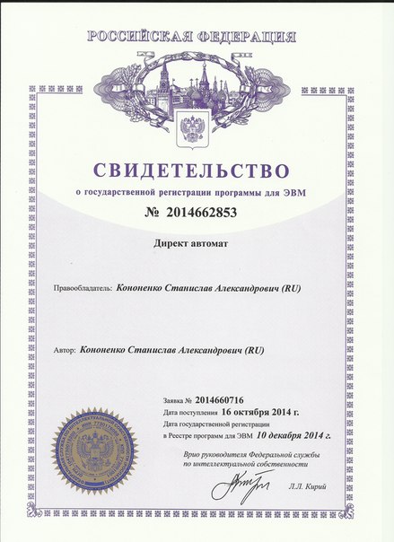 Директ автомат - коммерческая программа для ЭВМ с открытым кодом защищенная патентом №2014662853 от 10.12.2014 и авторским правом на территории Российской Федерации.